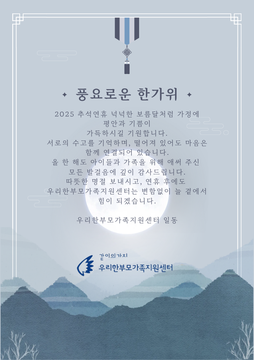 보름달이 차오르는 이때, 먼저 한마디 전하고 싶습니다. 올 한 해도 지금까지 잘 버티셨습니다. 매일의 일과, 아이 돌봄, 집안일까지 혼자서 감당해 내신 걸 우리는 알고 있습니다. 남들이 보지 못한 수많은 순간 새벽에 일어나 도시락을 준비하던 손, 아픈 몸을 이끌고도 아이를 챙기던 눈빛, 마음이 무겁던 날에도 웃음을 만들어 내던 표정...그 모든 시간이 모여 오늘의 당신과 아이를 지켜 왔습니다. 정말 수고 많으셨습니다.